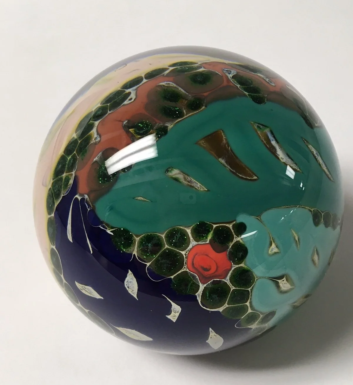 Out of the heat come these glorious orbs, making a whole, mesmerizing world in your hand. Many have unusual raised glass surfaces, or designs embedded in successive layers. All used his own pulled colored and latticino (twisted) canes of glass, for riots of color and detail.